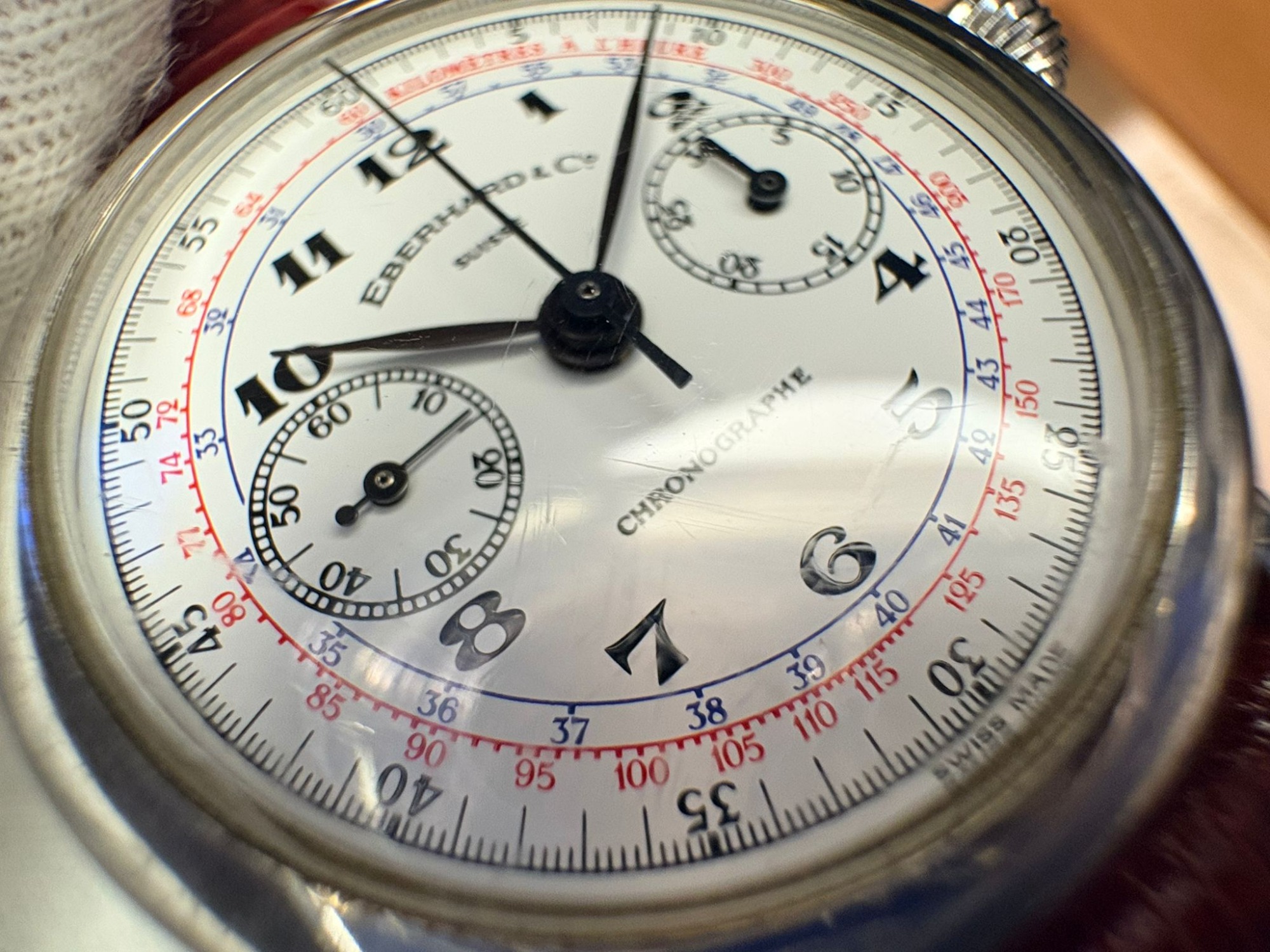 • Multi-scale sector dial, typical of vintage pilot/medical chronographs
